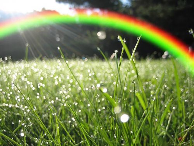 Mải vẩn vơ suy nghĩ về những cơn mưa ngày xưa, cơn mưa rào lúc bấy giờ đã tạnh từ khi nào mà em đâu hay. Bầu trời quang đãng hơn và dần chuyển sang màu xanh dương vốn có. Gió thổi nhẹ mơn man da mặt. Từng tia nắng lật đật trở về, nhưng không phải là những cái nắng chói chang như trước mà là những tia nắng vàng nhẹ nhàng phản chiếu vào những hạt bụi mưa nhỏ li ti còn sót lại trên mặt lá cây và tạo nên một khung cảnh tuyệt đẹp hiếm thấy– đó là cầu vồng bảy sắc lung linh phía chân trời. Cảnh vật đẹp như ở xứ sở thần tiên cùng không khí trong lành làm lòng người như dịu lại.