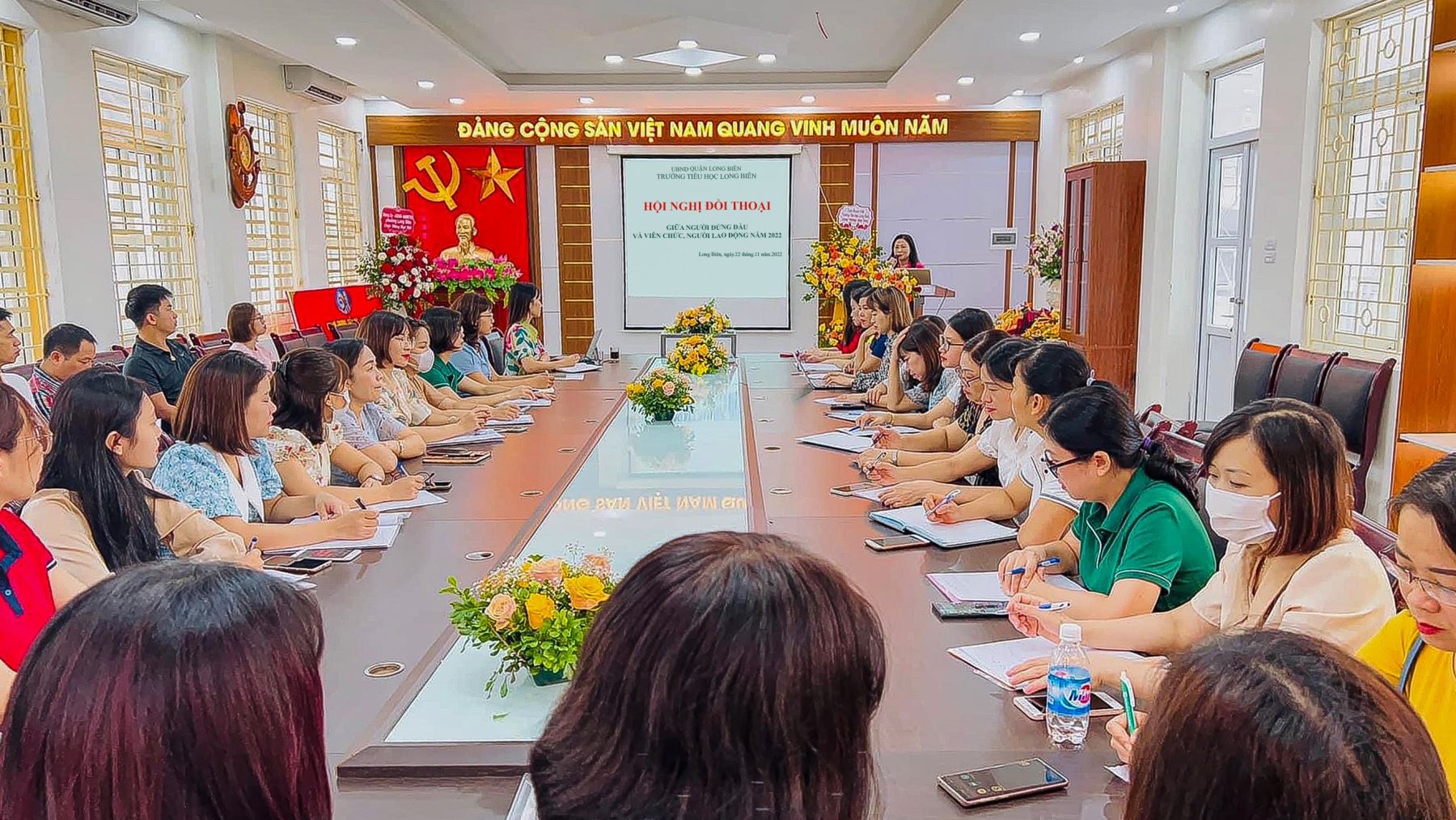 !important; Chiều ngày 22/11/2022, trường Tiểu học Long Biên đã tổ chức Hội nghị Đối thoại giữa Hiệu trưởng nhà trường với toàn thể GV, NV, NLĐ về việc xây dựng văn hóa ứng xử, đảm bảo an ninh an toàn trong trường học. Tại hội nghị có sự tham gia của toàn thể cán bộ, giáo viên, nhân viên nhà trường cùng BGH nhà trường.