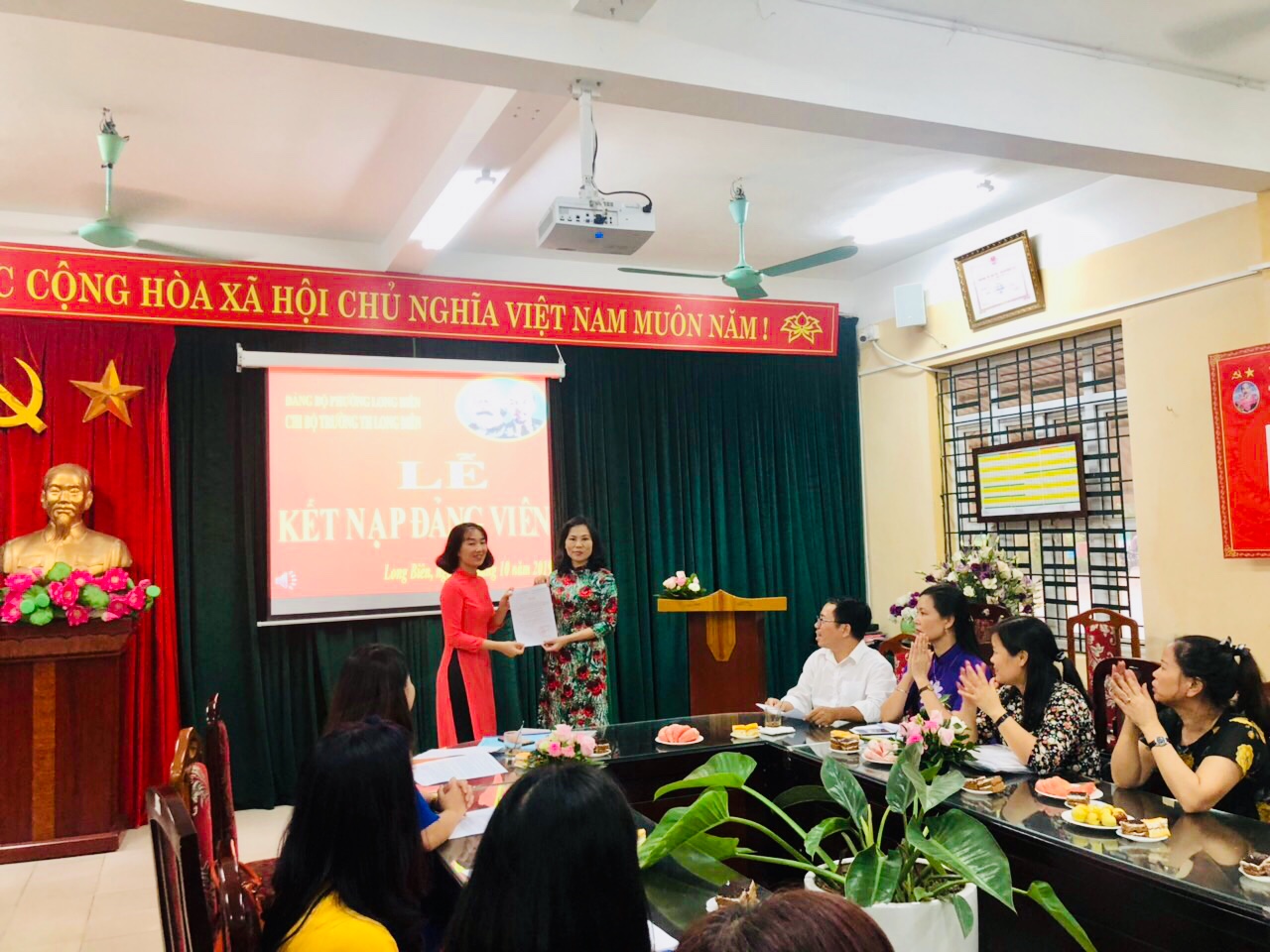 Sau một thời gian làm việc khẩn trương, nghiêm túc và trang trọng, buổi lễ kết nạp Đảng viên mới của chi bộ trường Tiểu học Long Biên đã thành công tốt đẹp. Xin chúc mừng các đồng chí Đảng viên mới, chúc các đồng chí dù ở cương vị nào cũng sẽ phát huy bản lĩnh, năng lực của một Đảng viên được bồi dưỡng, kết nạp tại chi bộ trường Tiểu học Long Biên.