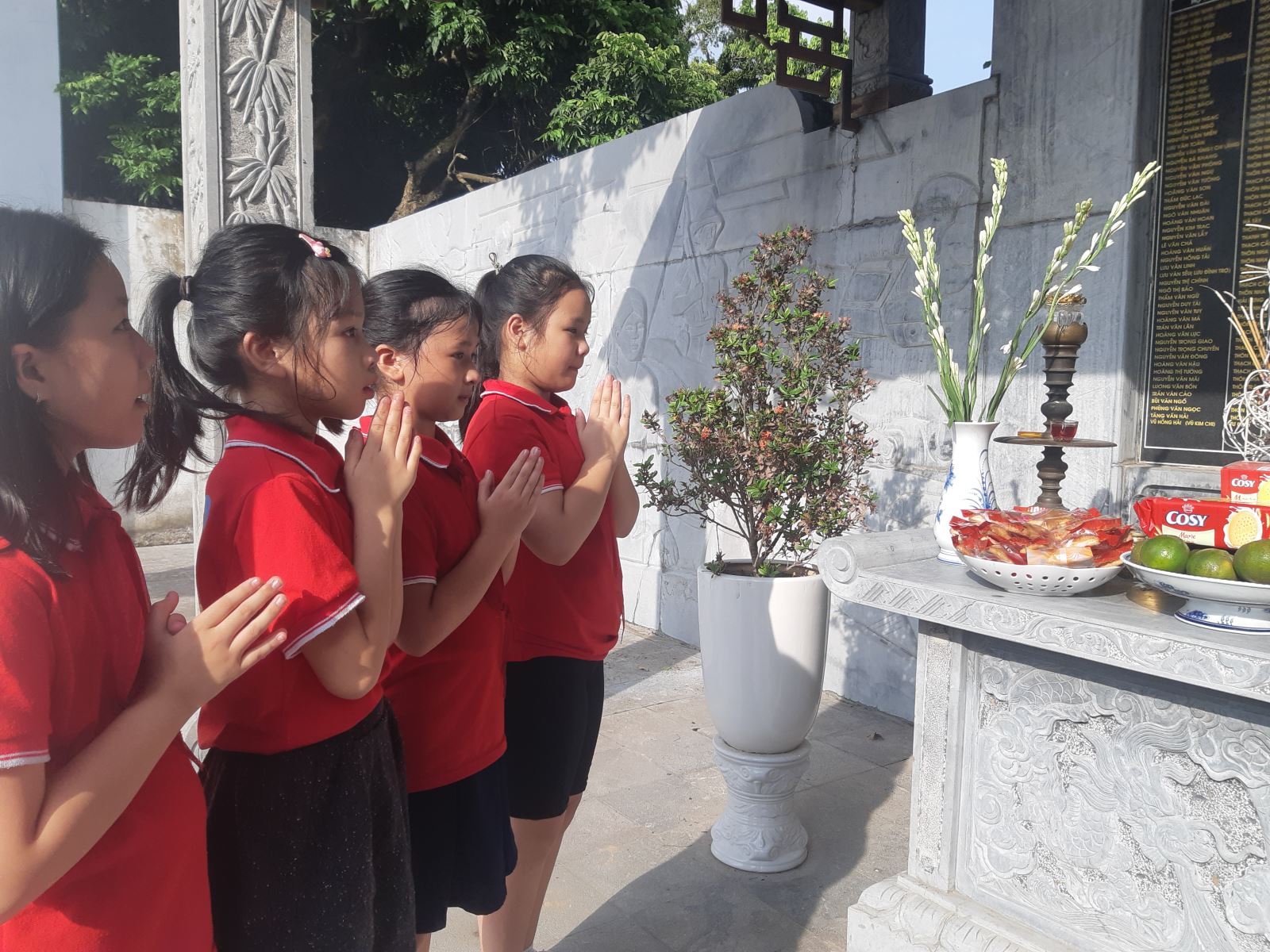 !important; 14 giờ 30 phút, các cô bác Ban Phụ huynh lớp đã có mặt trước cổng trường với bó hoa huệ trắng muốt. Cô giáo và các bạn học sinh đồng phục chỉnh tề, xếp hàng ngay ngắn cùng xuất phát. Quãng đường từ trường sang UBND phường Long Biên đi vèo một loáng đã đến nơi. Tập trung dưới bóng mát của mấy cây xoài trong sân Ủy ban, các bạn được nghe cô giáo chủ nhiệm giới thiệu về đài tưởng niệm các Liệt sĩ và tấm bia khắc tên tuổi các Bà mẹ Việt Nam Anh hùng của phường Long Biên cùng danh sách các Liệt sĩ đã hy sinh trong hai cuộc kháng chiến chống Pháp và chống Mỹ. Rồi từng nhóm được phân công quét dọn xung quanh khu vực Tượng đài và Bia tưởng niệm. Nhóm khác thì cùng các cô bác BPH lấy nước, cắm hoa. Nhân dịp Tết Trung thu nên các cô bác BPH lớp đã chuẩn bị những chiếc bánh nướng bánh dẻo xinh xắn để các con thắp hương các Bà mẹ VNAH và các Liệt sĩ. Khi được đứng trước tấm bia Tổ quốc ghi công, các bạn học sinh xúc động nhẩm đọc tên những Liệt sĩ đã hy sinh và thầm hứa : chúng cháu sẽ cố gắng học tập tốt, vâng lời thầy cô cha mẹ, để sau này lớn lên tiếp bước cha anh đi trước, góp phần xây dựng và bảo vệ Tổ quốc Việt Nam thân yêu. Mặc dù trời nắng nóng nhưng các bạn học sinh chẳng muốn ra về. Bạn nào cũng muốn được nhẩm đọc hết những dòng tên trên tấm bia đá trước mặt...