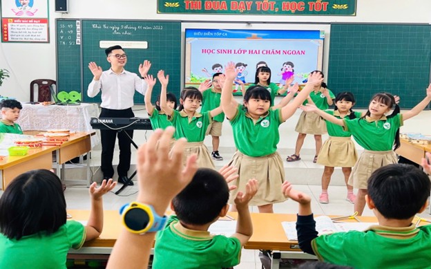 Tiết học âm nhạc của thầy Minh luôn là khoảng thời gian được các em học sinh háo hức mong chờ nhất trong tuần. Với cây đàn ghi-ta quen thuộc và giọng hát truyền cảm, thầy mang đến không khí học tập vui tươi, sinh động nhưng cũng đầy cảm xúc. Thầy không chỉ dạy các em hát đúng nốt, đúng nhịp, mà còn giúp các em cảm nhận được cái hay, cái đẹp trong từng giai điệu. Mỗi bài học dưới sự hướng dẫn của thầy đều trở thành một hành trình khám phá âm nhạc đầy mới lạ – nơi học sinh được thỏa sức thể hiện cảm xúc, phát huy năng khiếu và học cách lắng nghe bằng cả trái tim. Nhờ sự sáng tạo và linh hoạt trong cách giảng dạy, tiết học của thầy không chỉ là một giờ học, mà còn là một buổi biểu diễn nhỏ, nơi mỗi học sinh đều có thể tỏa sáng.