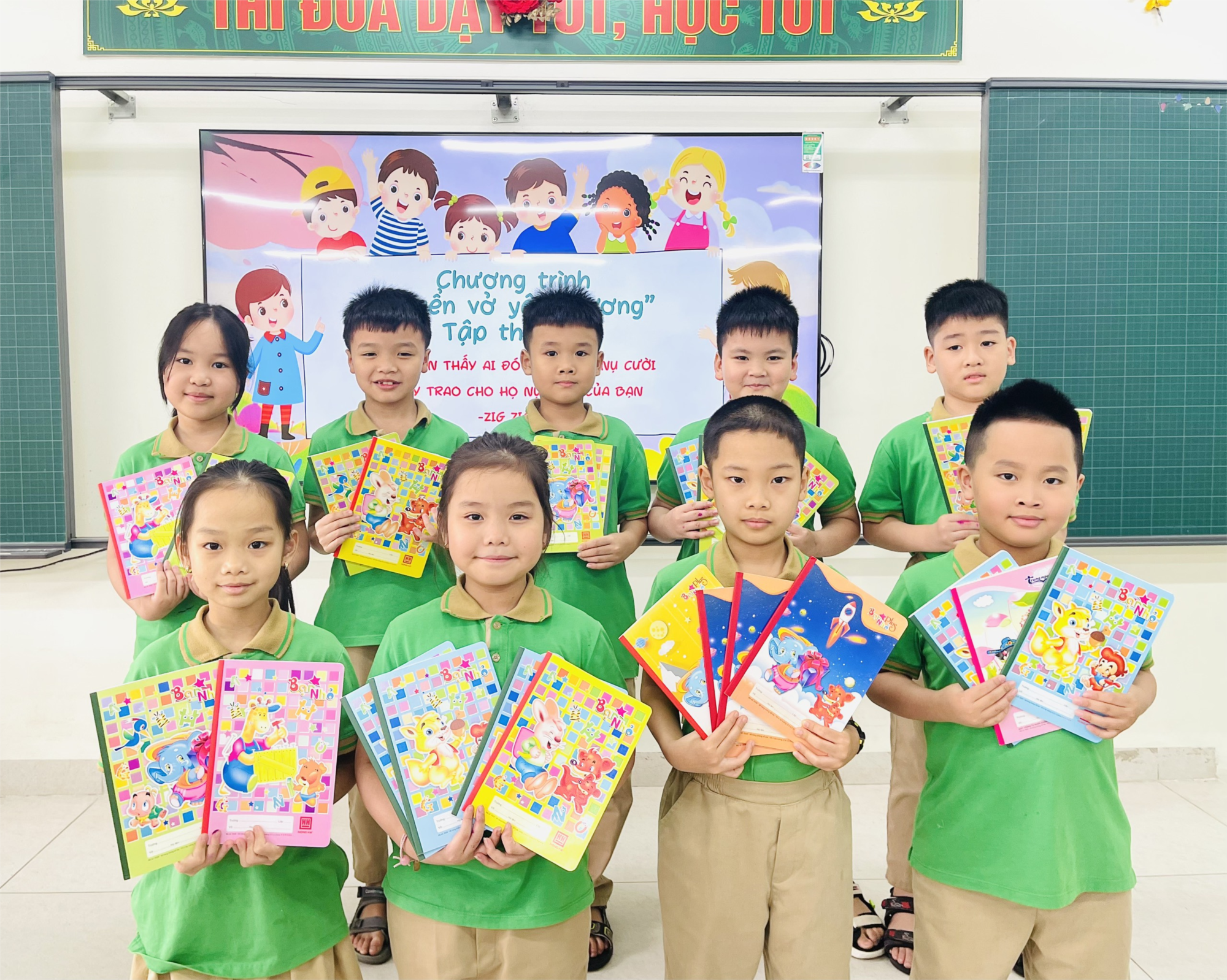 Niềm vui tươi và gương mặt rạng rỡ nụ cười của các bạn học sinh khi cùng nhau góp những quyển vở ý nghĩa. Mong rằng các bạn học sinh vùng xa khi đón nhận món quà ý nghĩa này sẽ có nhiều bài học bổ ích được viết lên những trang vở yêu thương.