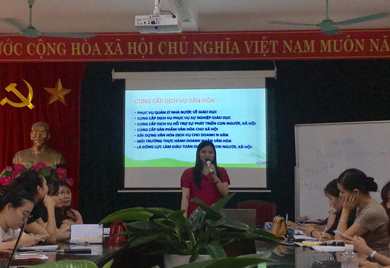 Với cách nói giản dị, mộc mạc, nhẹ nhàng cô đã cung cấp chia sẻ nhiều thông tin về chủ đề. Theo như cô nói cung cấp dịch vụ văn hóa bao gồm phục vụ quản lí nhà nước về giáo dục; cung cấp dịch vụ phục vụ sự nghiệp giáo dục; cung cấp dich vụ hỗ trợ sự phát triển con người, xã hội; cung cấp sản phẩm văn hóa cho xã hội. Từ đó, cung cấp dịch vụ văn hóa nhằm phục vụ cho sự khai sáng của con người, dân tộc; phục vụ cho sự tự do, chủ quyền của dân tộc; phục vụ cho sự phát triển của dân tộc; bồi dưỡng tình yêu, sự tự tôn, tự hào và sứ mệnh cao cả.