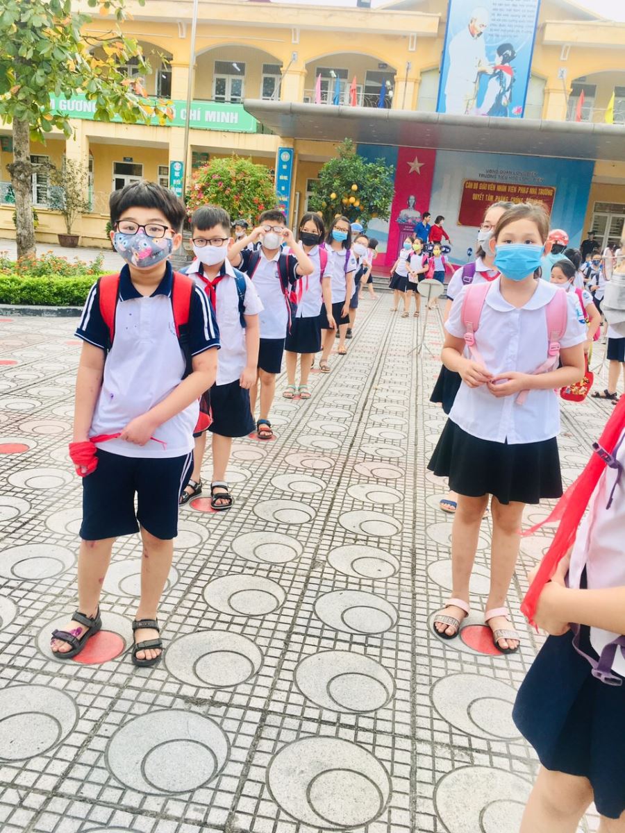 Khác hẳn với những buổi học trước đây, hôm nay các em HS trường Tiểu học Long Biên được cô Hiệu trưởng, cô Hiệu phó cùng các thầy cô giáo ân cần chào đón ngay từ cổng trường. Mặc dù các em đã biết rất rõ những hoạt động sẽ diễn ra, những việc các em cần thực hiện trong buổi học đầu tiên đến trường sau mùa dịch,/nhưng trên khuôn mặt ngây thơ của các em hình như đều biểu hiện sự e dè, ngạc nhiên, … “Ôi, sao… lạ quá?”. Có những em HS lớp Một, lớp Hai còn ngơ ngác, rụt rè tới cổng trường nhưng vẫn còn cố níu bàn tay mẹ . Nhưng rồi các em nhanh chóng được bàn tay các thầy cô đón dắt. Bạn nào cũng ngoan ngoãn đi theo hướng dẫn một cách khẩn trương, nhanh chóng.