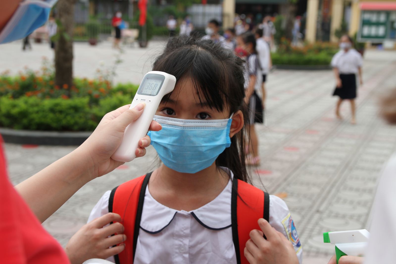 Được sự quan tâm của tập thể cán bộ, giáo viên, nhân viên nhà trường và các cấp lãnh đạo của Quận, phường, trung tâm y tế, lực lượng công an, dân phòng cũng đã có mặt từ rất sớm để kiểm tra sự chuẩn bị của nhà trường trong ngày đầu đón các con trở lại trường sau kì nghỉ học rất dài. Hôm nay, tôi cũng có mặt trực tiếp ở sân trường cùng phối hợp với các cô giáo chủ nhiệm để đo thân nhiệt và sát khuẩn cho các con trước khi vào lớp học. Tôi đã được chứng kiến sự tận tâm của các thầy giáo cô giáo, đoàn viên thanh niên, các đồng chí công an khu vực cũng như dân phòng để hướng dẫn phân luồng giao thông tránh ùn tắc trước cổng trường trong ngày đầu đi học trở lại và đón các con học sinh. Nhìn những giọt mồ hôi lăn dài trên má và ướt đẫm áo mồ hôi của các thầy cô những lúc nào cũng nở nụ cười tươi tắn đã xua đi cái nóng oi bức của mùa hè. Hình ảnh các con ngơ ngác tìm vị trí, tìm cô giáo của lớp mình trong ngày đầu tiên quay trở lại trường thì có ngay cô giáo chạy đến hỏi: “Con học lớp nào, ra đây cô sát khuẩn tay và đo thân nhiệt cho”. Dường như tất cả các thầy cô giáo đều đón, đo thân nhiệt và sát khuẩn tay cho các con mà không có sự phân biệt con của mình hay con lớp khác. Tất cả thầy cô giáo đón các con bằng cả tình yêu và sự chăm sóc tận tình, chu đáo. Còn bác bảo vệ thì 2 tay xách 2 túi sách vở của các con và đưa lên lớp giúp. Đó là những hình ảnh thật đẹp, thật ý nghĩa ngoài sân trường. Ở lớp tôi, nhiều gia đình khi đưa con đi học đã ủng hộ những chai sát khuẩn, những hộp khẩu trang y tế để cho các con dùng tại lớp.
